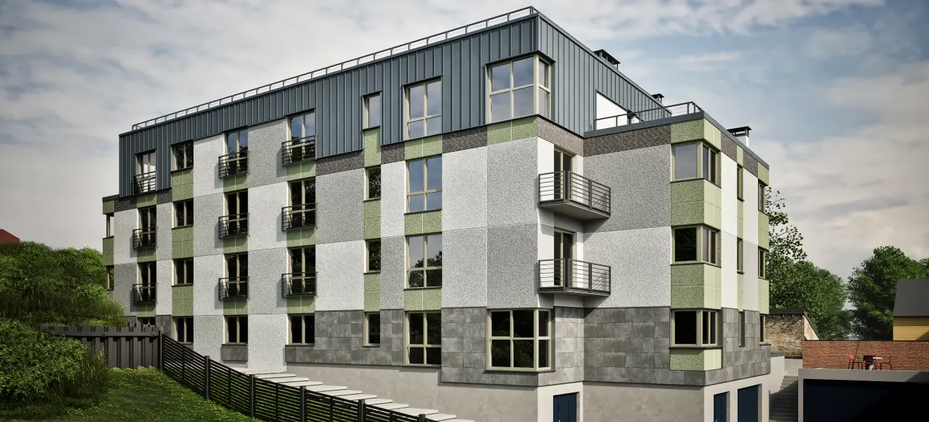 Kompleksā ir pārdomāts arhitektūras dizains, kas izceļ gan mūsdienīgu funkcionalitāti, gan estētisko pievilcību. Ēkas dizains un apdares kvalitāte rada ekskluzīvas, modernas dzīvesvietas sajūtu. Dzīvokļi ir aprīkoti ar lieliem logiem, nodrošinot dabisko apgaismojumu un radot plašuma sajūtu, kas ir īpaši svarīgi pilsētas vidē.