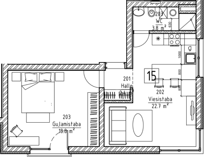 Uzstādītas iebūvētas mēbeles un tehnika no vadošajiem Eiropas zīmoliem: Colombini Casa virtuves un skapji, Blum furnitūra, Franke, Hansgrohe un Villeroy & Boch santehnika, LG sadzīves tehnika, Zonda Lighting apgaismojums.